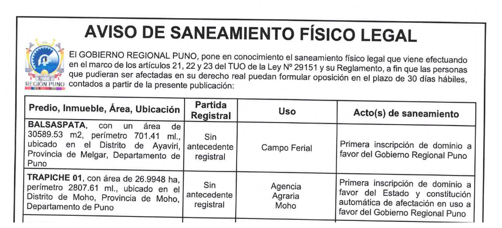 EI GOBIERNO REGIONAL PUNO, pone en conocimiento el saneamiento físico legal que viene efectuando en el marco de los artículos 21, 22 y 23 del TUO de la Ley N° 29151 y su Reglamento, a fin que las personas que pudieran ser afectadas en su derecho real puedan formular oposición en el plazo de 30 días hábiles, contados a partir de la presente publicación: