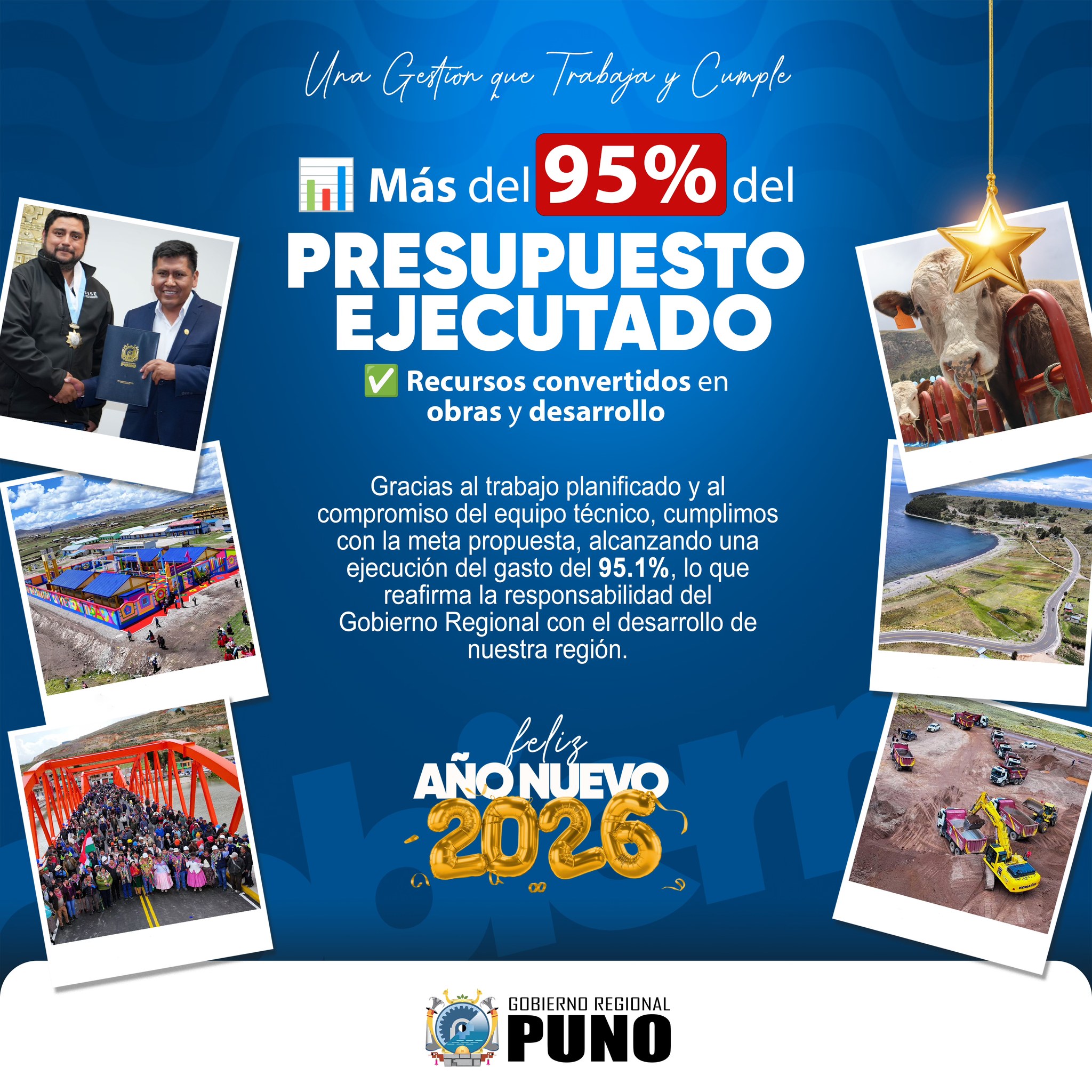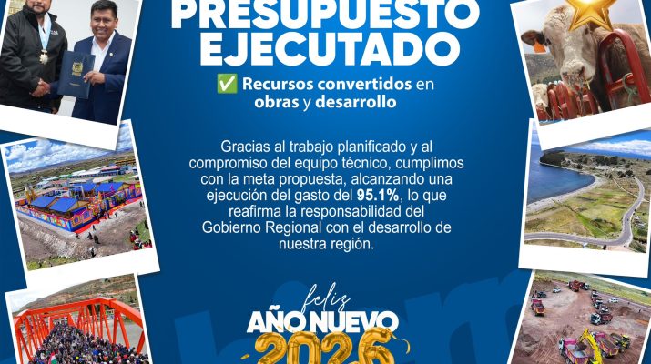 ✍️ [Puno, 01 de enero 2026] El Gobierno Regional Puno alcanzó una ejecución presupuestal récord del 95.1 por ciento, consolidándose entre las regiones con mejor desempeño a nivel nacional.