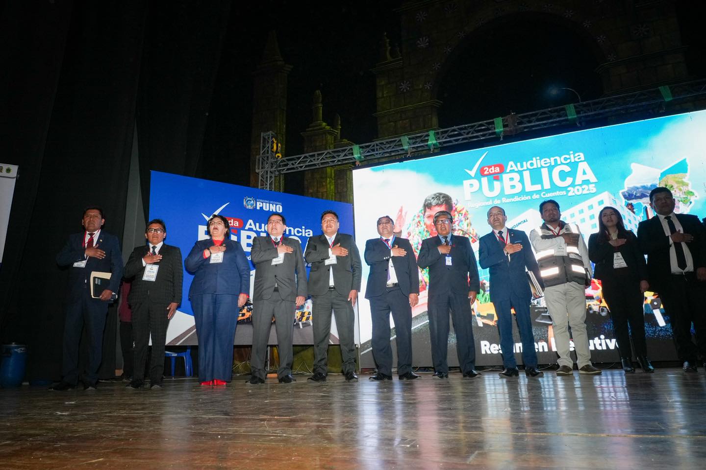 ✍️ [Puno, 30 de setiembre del 2025] El titular del Gobierno Regional Puno (GRP), Richard Hancco Soncco, dio a conocer los avances en la ejecución presupuestal, infraestructura y gestión de proyectos, en la II Audiencia Pública Regional de Rendición de Cuentas 2025, desarrollada con la participación de autoridades regionales, provinciales, distritales y representantes de la sociedad civil, en el Teatro Municipal de Puno.
